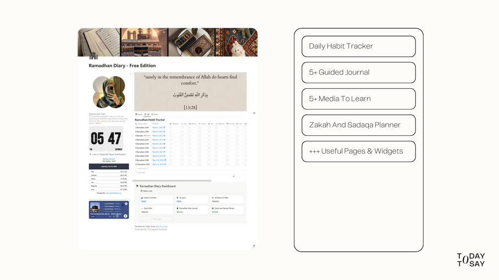 You will receive a free comprehensive template designed to enrich and enhance your spiritual journey throughout the sacred month of Ramadhan 💗